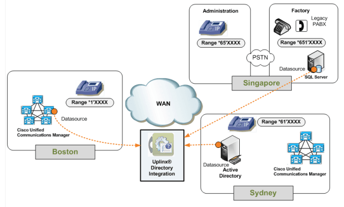 The Uplinx® Enterprise Directory system supports data sourcing from Microsoft Active Directory, CUCM, Microsoft SQL, files and permanent static entries (ie Emergency numbers) added via the WebGUI.