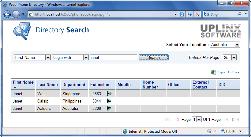 The Uplinx® Enterprise Directory system also provides a web based phone directory based on this consolidate data which integrates with the Cisco web dialer. Users can use “click-to-dial” from a web page published by the Enterprise Directory system. The web based phone directory can be easily integrated into the enterprise Intranet to add value to all users.